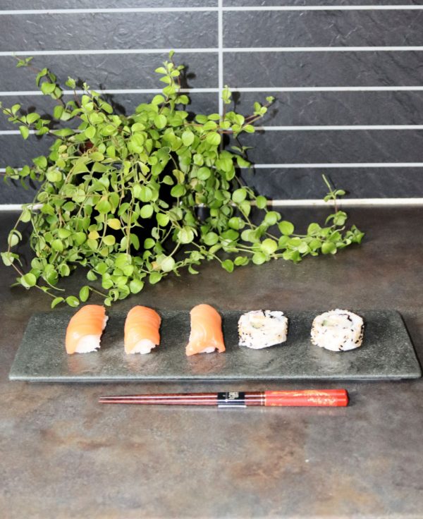 Black Sushi Plate är ett urläckert, japanskt fat. Ställ Black Sushi Plate på bordet och låt gästerna ta för sig av sushi.