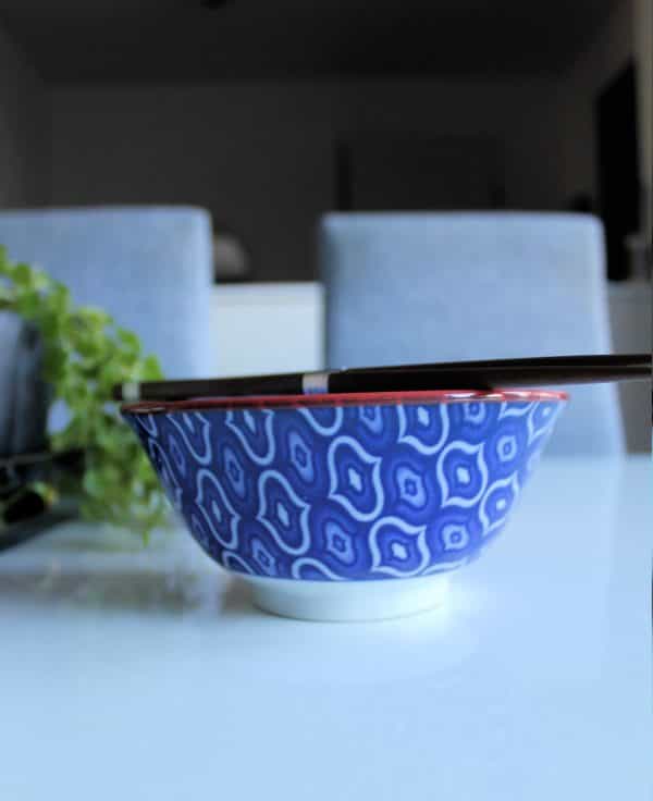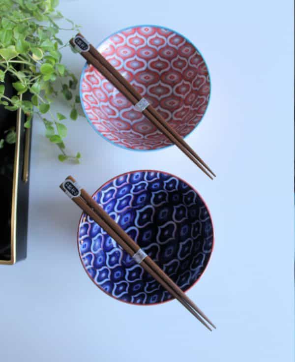 Setet består av en blå skål, en röd skål och två set ätpinnar.