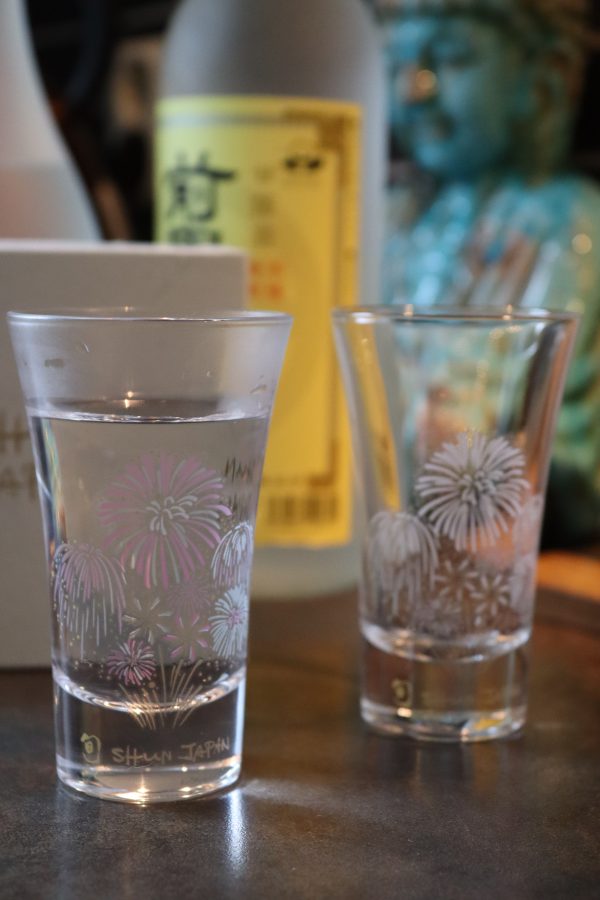 Fireworks sakeglas är japanska glas som kan användas när du vill njuta av sake eller varför inte ett kallt glas bubbel. Det magiska med Fireworks sakeglas är, att när du häller i riktigt kall dryck i glasen, så ändrar mönstret på glasens utsida färg till rosa och blått. Glasen säljs i set om två glas och kommer i en vacker presentask.