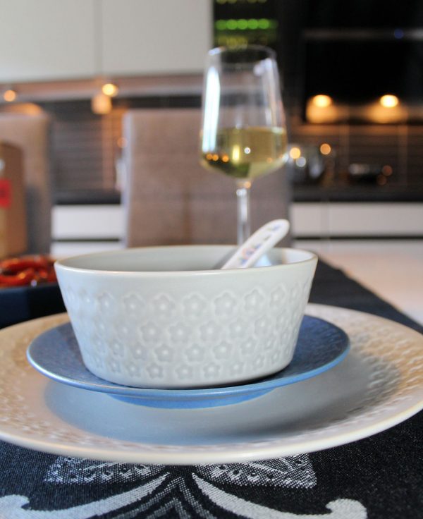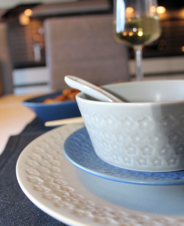 Press Flower Grey Bowl är en ljusgrå, japansk skål, som har ett fint, präglat mönster av körsbärsblommor i kanten. Det vackra, enkla men dock så eleganta mönstret bidrar till att visa japansk porslin när det som är som bäst, avskalat och funktionellt.