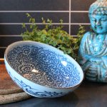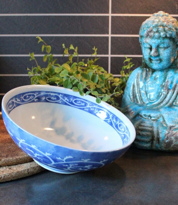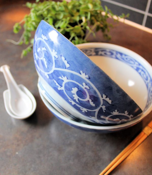 Ramenskålens utsida är vackert blåfärgad, med ett fint, vitt swirlmönster av blad. På insidan av skålen finns en blåmönstrad kant. Skålen har allt – den är modern, traditionell, samtidiga och rustik. Allt man kan söka efter i en ramenskål som är perfekt anpassad för god, avslappnad ramen som serveras i skön hemmamiljö.