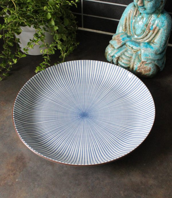 Sendan Tokusa fat med sitt speciella blåa mönster och vita botten har snabbt blivit populärt över hela världen. Det unika mönstret designades före den nuvarande kejsarens tidsperiod och därför finns stämpeln Showa på fatets undersida. Du hittar fat och olika skålar i samma serie. Vackrare än så här kan man knappast duka ett bord och det blåmönstrade porslinet gör varje måltid minnesvärt. Blå cirklar utstrålar från porslinets mittpunkt och det är mönstret som gör detta porslin speciellt.